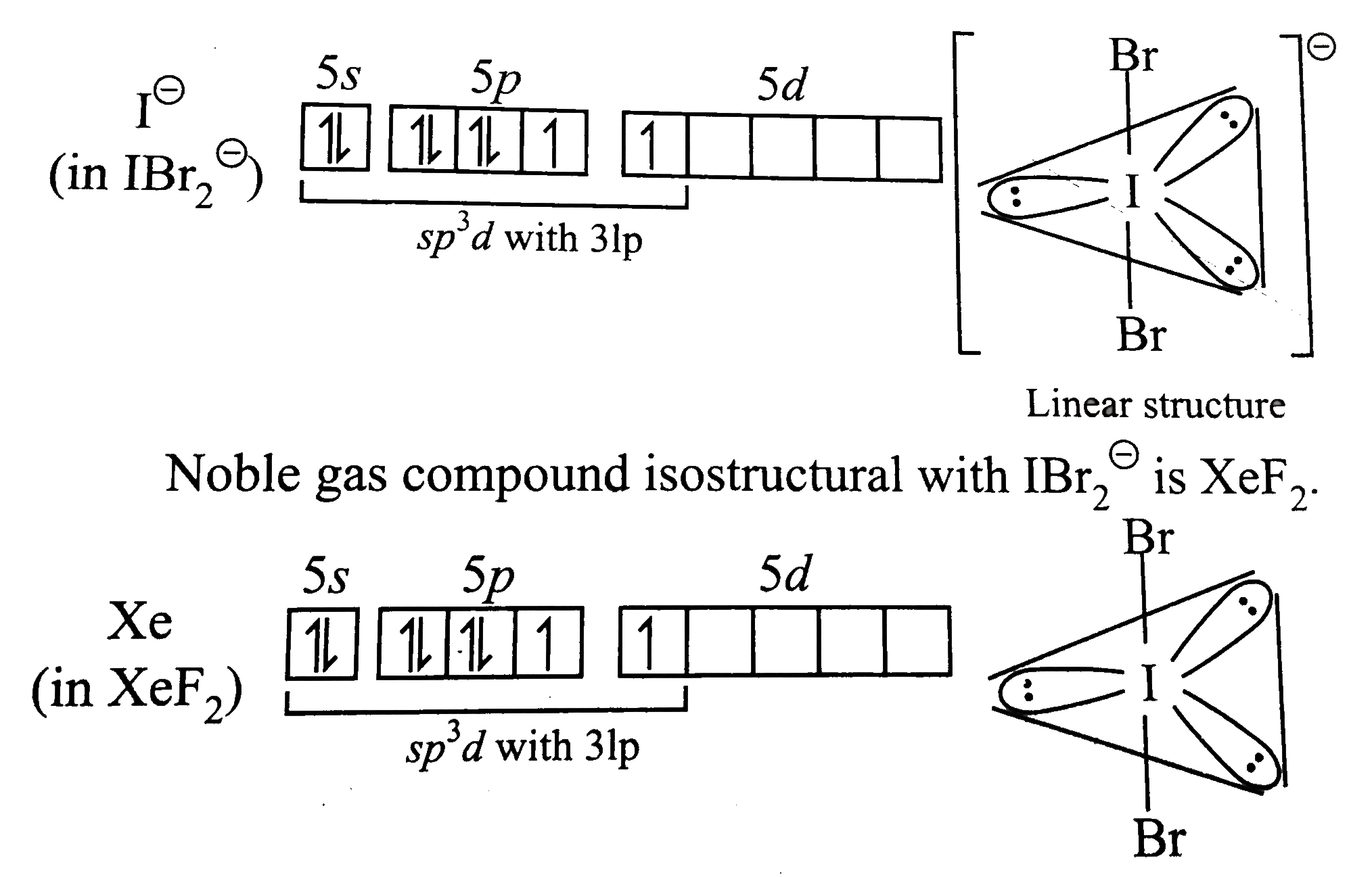 Give the formula and describe the structure of a noble gas which is isostructural with (i). Icl_4^(ɵ) (ii). I Br_2^(ɵ) (iii). BrO_3 |