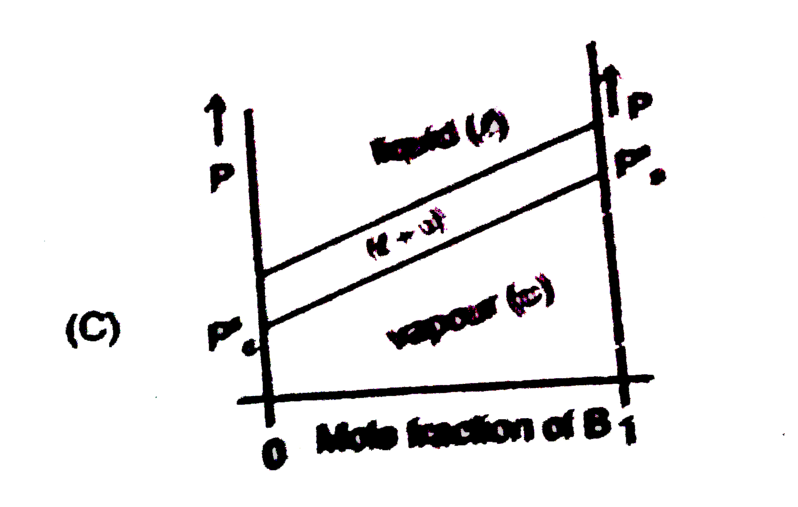 `P=X_B^lP_B^@+X_C^lP_C^@` `=X_B^lP_B^@+(1-x_B^l)P_C^@` `=P_C^@+(P_B^@-P_C^@)X_B^l=P_C^@+(P_B^@-P_C^@)X_B` The second curve will not be a straight line having equation `P=(P_B^@-P_C^@)/(X_B^l(P_C^@-P_B^@)+P_B^@)` |