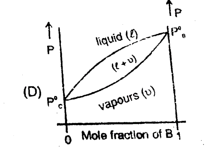 Ideal Solution at Fixed Temperature Consider two liquids 'B' and 'C' that form an ideal solution We hold the temperature fixed at some value T that is above the freezing point of 'B' and 'C' We shall plo the system's pressure P against x_B,The overall mole fraction of B in the system : x_B=(n_(B_"total"))/(n_"total")=(n_B^l+n_B^v)/(n_B^v+n_C^l+n_C^v+n_B^l) Where n_B^l and n_B^v are the number of moles of B in the liquid and vapor phases, respectively, For a closed system x_B is fixed, although n_B^l and n_B^v may very. Let the system be enclosed in a cylinder fitted with a piston and immersed in a constant temperature bath To see what the P-versus - x_B phase diagram looks like let us initially set the external pressure on the piston high enough for the system to be entirely liquid (point A in figure ) As the pressure is lowered below that at A.the system eventually reaches a pressure where the liquid just begins to vaporizes (point D).At point D, the liquid has composition x_B^l where x_B^l at D is equal to the overall mole fraction x_B since only an infinitesimal amount of liquid has vapourized.What is the composition of the first vapour that comes off ? Raoult's law, P_B=x_B^vP_B^0 relates the vapour-phase mole fractions to the liquid composition as follows : x_B^v=(x_B^lP_B^0)/P and x_C^v=(x_C^lP_C^0)/P...(1) Where P_B^0 and P_C^0 are the vapour pressure of pure 'B' and pure 'C' at T where the system's pressure P equals the sum P_B+P_C of the parial pressures, where x_B^l=(n_B^l)/((n_B^l+n_C^l)) , and the vapour is assumed ideal. x_B^v/x_C^v=(x_B^lP_B^.)/(x_C^lP_C^.) ideal solution ...(2) Let B be the more volatile component meaning that P_B^0 gtP_C^0 Above equaion then show that x_B^v//x_C^v gt x_B^l//x_C^l .The vapour above an ideal solution is richer than the liquid in the more volatile component.Equations (1) and (2) apply at any pressure where liquid vapour equilibrium exists, not just at point D. Now let us isothermally lower the pressure below pointD,causing more liquid to vaporize . Eventually , we reach point F in figure. where the last drop of liquid vaporizes.Below F, we have only vapour . For any point on the line between D and F liquid and vapour phases coexist in equilibrium . If the above process is repeated for all other composition of mixture of C and B If all the points where vapours start converting into liquid are connectted and all the points where vapours get completely converted into liquid are connected then obtained graph will look like : |