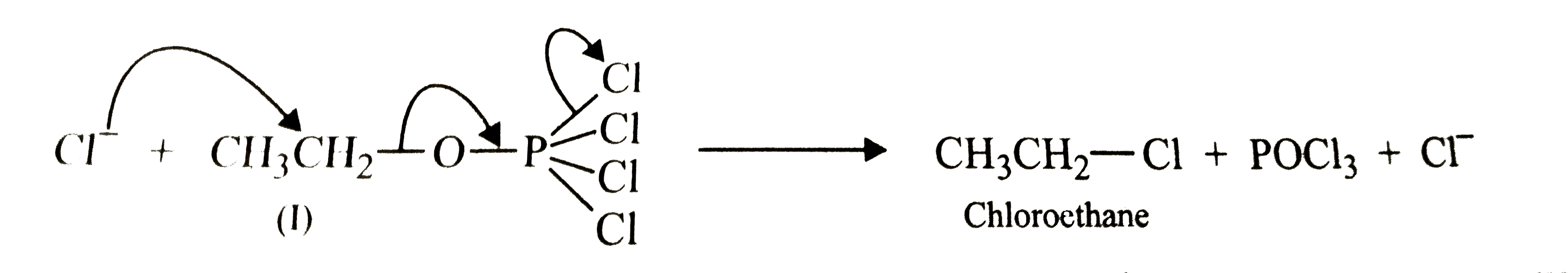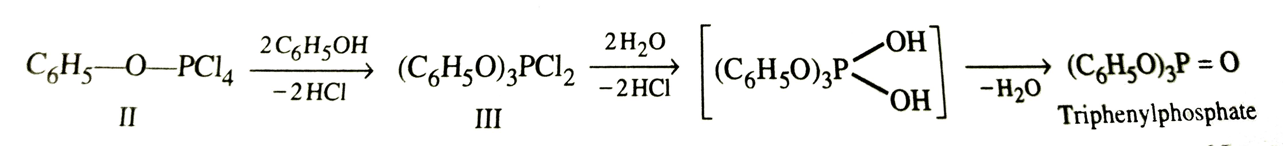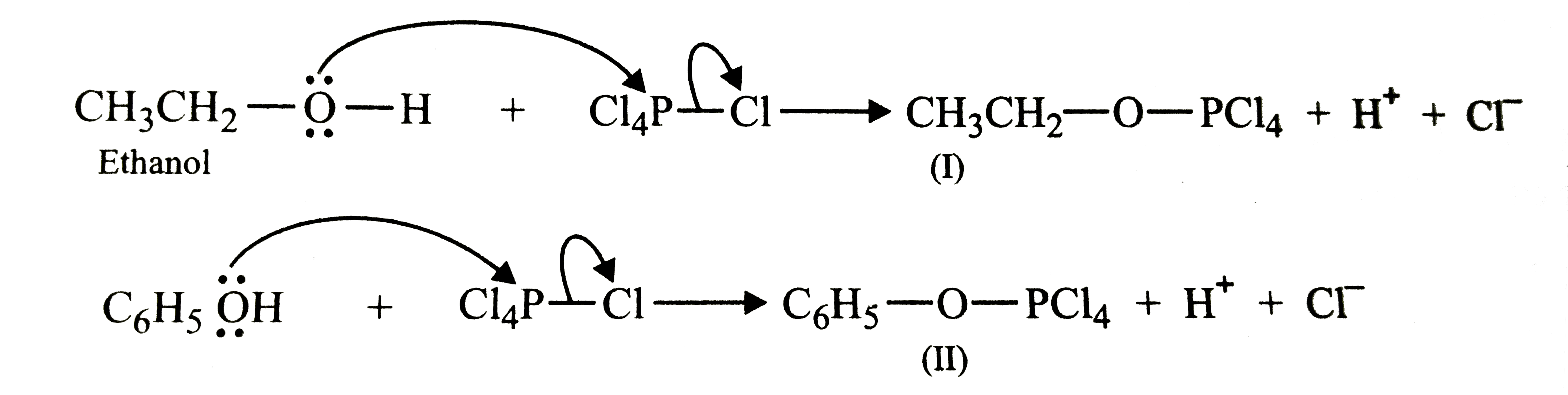 Answer» SOLUTION :To begin with both ethanol and phenol react with `PCl_(5)` to give the corresponding chlorophosphate ESTERS. Since in ethanol, C-O bond has only single bond CHARACTER, therefore, nucleophilic ATTACK by `Cl^(-)` ion occurs easily on chlorophosphate ester (I) to give chloroethane. however, in case of phenol, C-O bond has some double bond character due to resonance and hence difficult to break. instead nucleophilic attack by `C_(6)H_(5)OH` occurs twice on the chlorophosphate ester (II) to form intermediate (III). further, nucleophilic attack by `C_(6)H_(5)OH` on III does not occur due to steric hindrance. Instead (III) undergoes hydrolysis by water to form triphenylphosphate. .