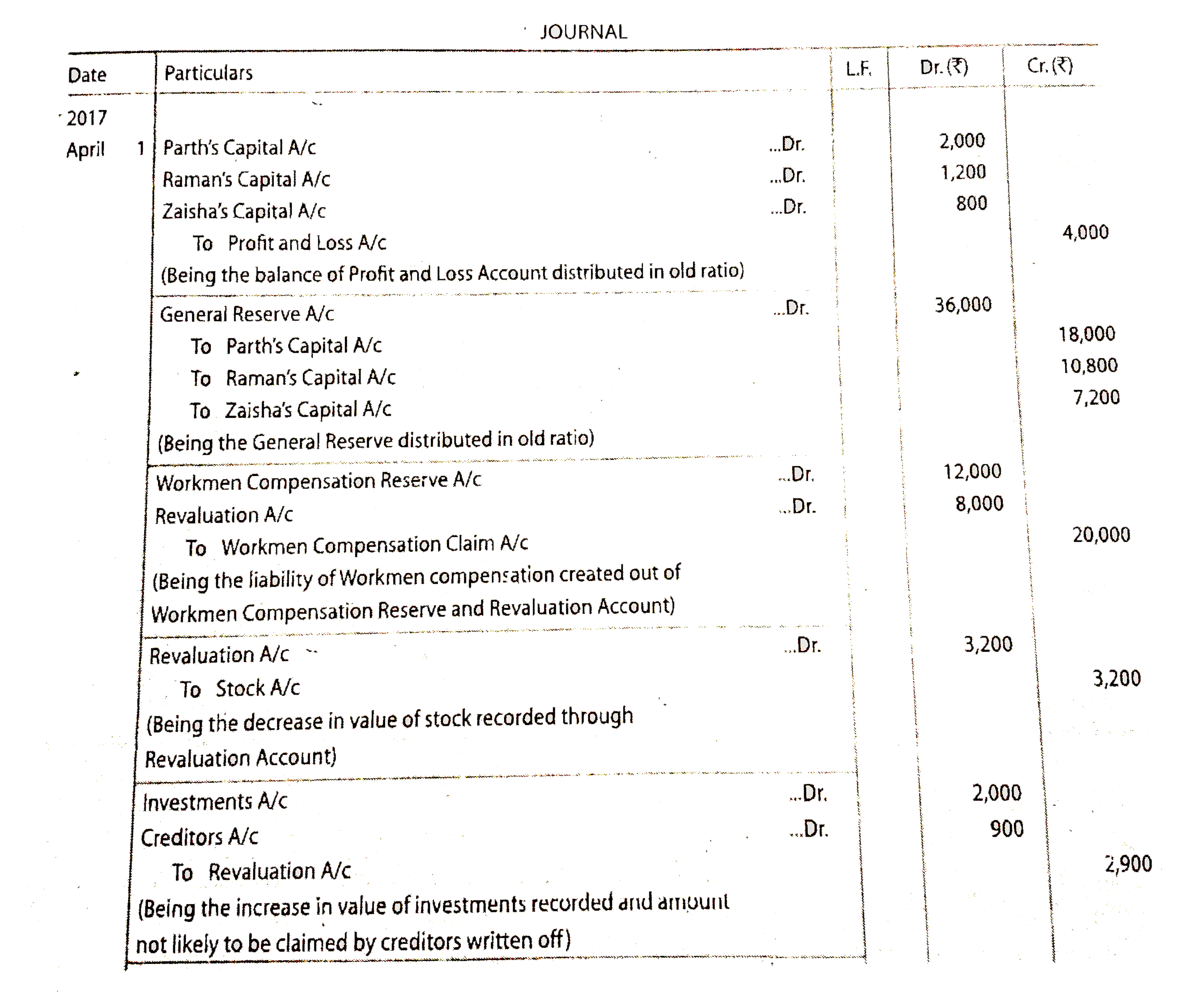 Parth, Raman and Zaisha are partners in a firm manufacturing furmiture. They have bem sharing profits and losses in the ratio of 5:3:2 From 1st April, 2017 they decided to share future profits and losses in the ratio of 2:5:3. Their Balance Sheet showed a debit balance of ₹4,000 in Profit and Loss Account, balance of₹36,000 in General Reserve and a balance of ₹12,000 in Workmen's Compensation Reserve. It was agreed that: (i)The goodwill of the firm be valued at ₹76,000. (ii)The Stock(bookvalue of ₹40,000) was to be depreciated by 8%. (iii)Creditors amounting to 900 were not likely to be claimed. (iv)Claim on account of Workmen's Compensation amounted to ₹20,000. (v) Investments(bookvalue₹ 38,000) were revalued at ₹ 40,000. PassnecessaryJournal entries for theabove. |