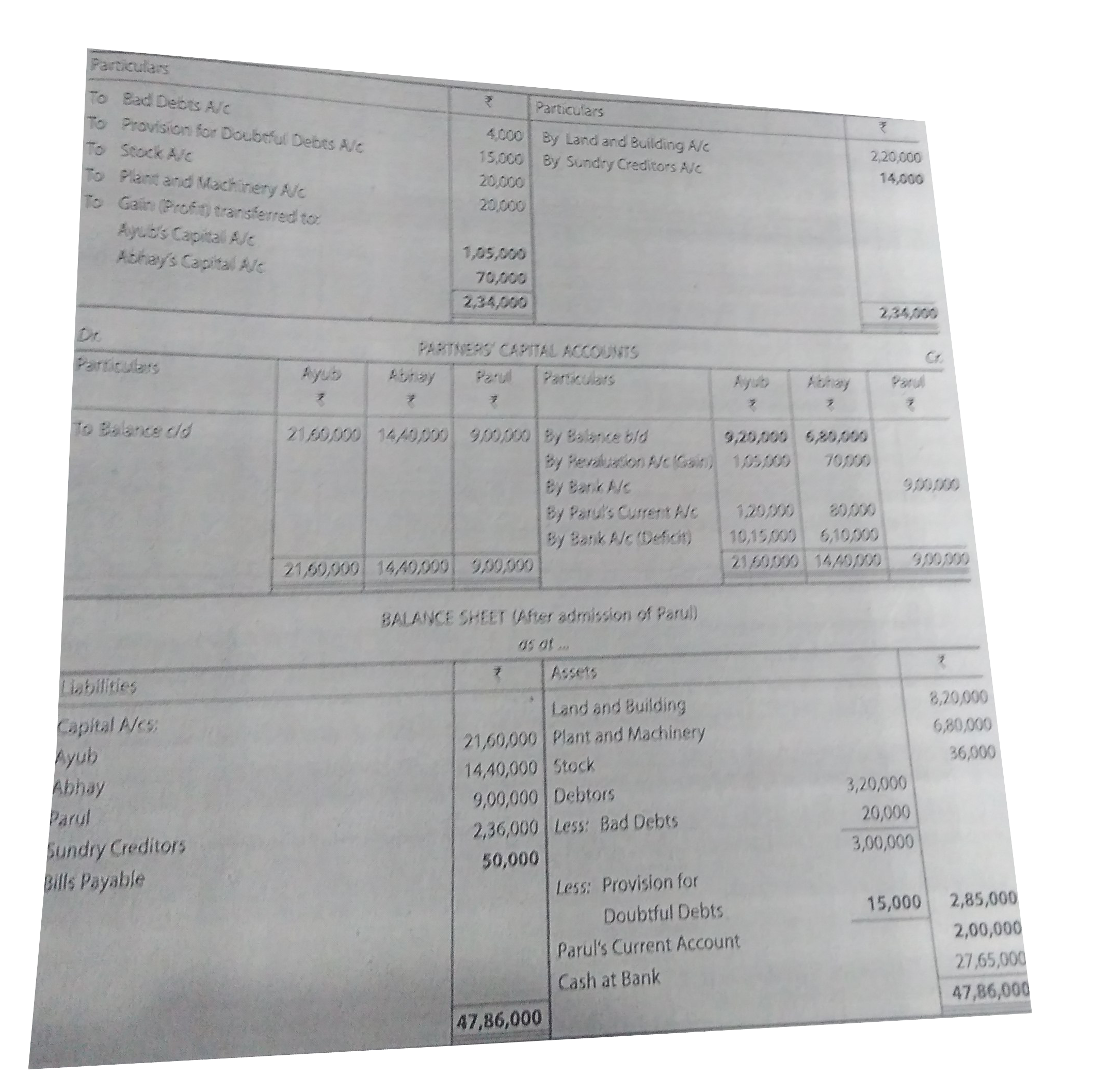 Answer» Solution : Notes: (1) Calculation of Missing Values of REVALUATION Account: They have been taken from the given Balance Shet of Reconstituted firm. For EXAMPLE: DECREASE in value of MachineryRs 40,000 is taken for MACHINERY. (2) Calculation of Opening Balances of X's Capital and Y's Capital: Following steps have been taken: Step 2. Put the value of Revaluation from Revaluation Account. Step 3. The amount ofRs 9,00,000 andRs 3,50,000 represent the Opening Balances of their Capitals, calculated as Balancing Figure. 3. Value of Bills Payable is calculated by taking the following steps: Step 1. Take the figure of Provision for Doubtful Debts from Revaluation Account and deduct it from debtors on the Balance SHEET, then we get Net debtors. Step 2. Find out total of Assets side of the Balance Sheet and put it as the total of Liabilities side. Step 3. Calculate the figure of Bills Payable as the Balancing Figure. |