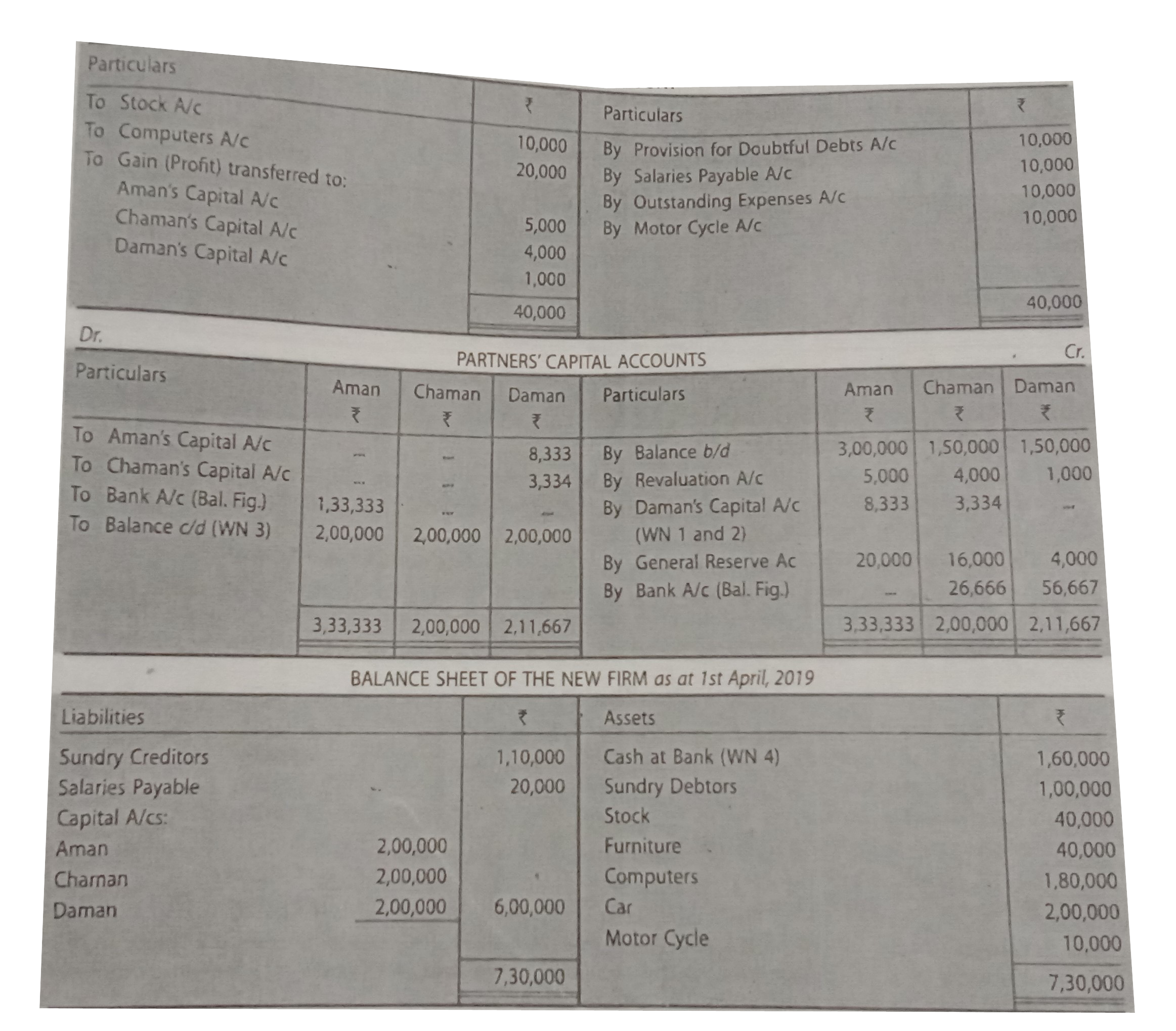 Aman,Chaman and Daman are partners sharingprofitsand losses in the ratio of5:4:1. Their Balance Sheet as at 31st March, 2019 was as follows: Profits-sharingratioo w.e.f 1st April, 2019 wasdecided to be equal. It was good among thepartners to carryout followingadjustments. (i) Stockto bereduced to ₹40,000. (ii) Provisionfor Doubtful Debts to bewritten back , since alldebtors are good. (iii) Computers to be reduced by ₹20,000. (iv) Outof theSalaries Payable, ₹10,000 wasnot payable as theemployee leftwithoutnotice. (v) Outsanding Expensewerenot payableanymore. (vi) An unrecorded asset (Motor Cycle) valued at ₹10,000 to beaccounted. (vii) Goodwillof the firmwas valued at ₹50,000. (viii) Totalcapitalof the firm₹6,00,000 was to bein profit-sharing ratio, excess capital tobc withdrawnandshortfallto bemade good. PrepareRevauation Account,Partners' CapitalAccountsand BalanceSheet of thenew firm. |