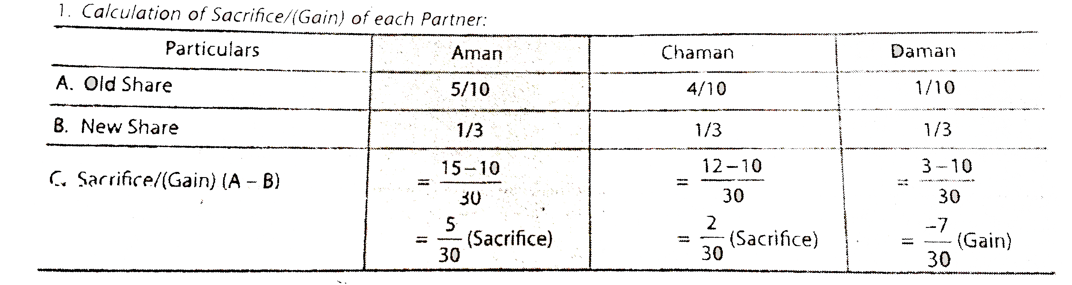 Answer» Solution :![]() Working note ![]() 2. Calculation ofSacrifice/(Gain) of EACHPARTNER: `{:(,,"Amar","Tarun","AKHIL"),(,"OLD Share",5//10,3//10,2//10),(,"New Share",2//5,2//5,1//5),(,"Sacrifice/(Gain) = Old Share -New Share",=(5-4)/(10),=(3-4)/(10),=(2-2)/(10)),(,,=1//10,=-1//10,"Nil"),(,,"Sacrifice","(Gain)",),(,"Proprtion AMOUNT to be Adjueted","₹19,200(Cr.)","₹19,200(Dr.)",):}` |