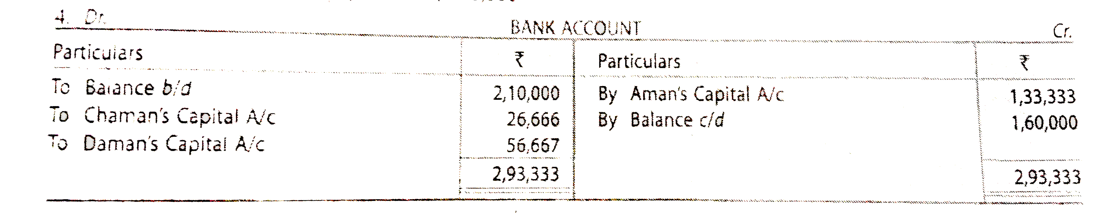 Answer» Solution :![]() WORKING Note: ![]() 2. Adjustmentof GOODWILL: `{:(,,,"₹", "₹"), ("DAMAN's Capital A/c (50,000" xx "7/30)", "....Dr." ,, 11","667 , ), ("To Aman's Capital A/c (₹ 50,000"xx "5/30)" ,,,, 8","333), ("To Chaman's Capital A/c(₹ 50,000" xx "2/30)" ,,,, 3","334):}` 3. TotalCapitalof the firm = ₹6,00,000 Capitalof eachPartner in THEFIRMAS per new Profit-Sharingratio will be₹ 2,00,000(i.e., `₹6,00,000 xx 1//3`) `{:(,,,"₹", "₹"), ("Daman's Capital A/c (50,000" xx "7/30)", "....Dr." ,, 11","667 , ), ("To Aman's Capital A/c (₹ 50,000"xx "5/30)" ,,,, 8","333), ("To Chaman's Capital A/c(₹ 50,000" xx "2/30)" ,,,, 3","334):}` ![]() |