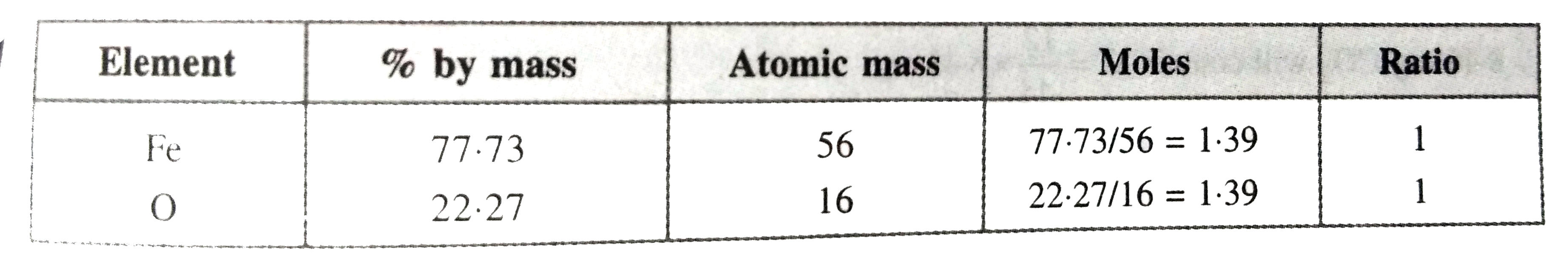 Answer» SOLUTION :Iron oxide = 0.5434 g Oxygen lost as `H_(2)O=0.1212g` `therefore"Iron "=0.5434-0.1210=0.4224g` `therefore""%" of FE"=(0.4224)/(0.5434)xx100=77.73%` `%" of O=100-77.73=22.27%` Hence, formula of iron oxide = FEO. |