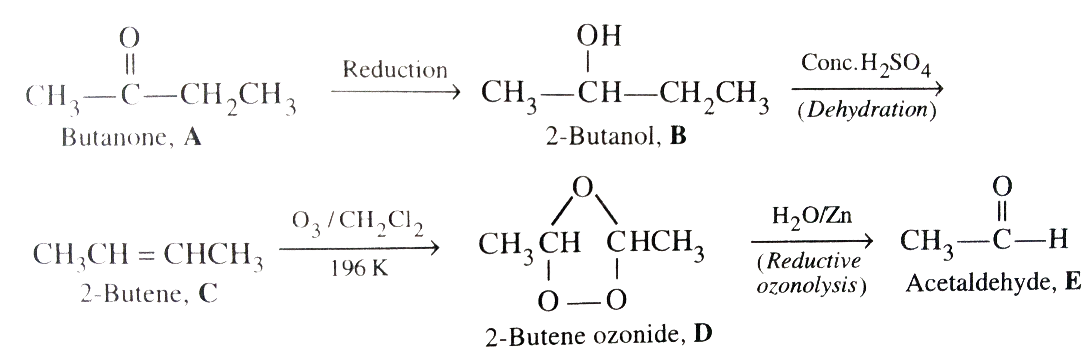 Answer» Solution :(i) Since ketone A `(C_(4)H_(8)O)` undergoes haloform reaction, it must CONTAIN the GROUPING, B must be 2-butanol ketone `A(C_(4)H_(8)O)` must be butanone `(CH_(3)COCH_(2)CH_(3))`. (ii) Since ketone A, i.e., butanone gives compound (B) on readuction, therefore, B must be 2-butanol `(CH_(3)CHOHCH_(2)CH_(3))`. (iii) Since B, i.e., 2-butanol on heating with `H_(2)SO_(4)` gives compound C which forms a mono-ozonide, therefore, compound C must be an alkene. (iv) Since alkene C forms a mono-ozonide D which on hydrolysis in presence of ZINC dust (i.e., reductive ozonolysis) gives only ACETALDEHYDE E, therefore, C must be a symmetrical alkene, i.e., 2-Butene. (v) All the reactions involved in the problem can now be explained as follows: