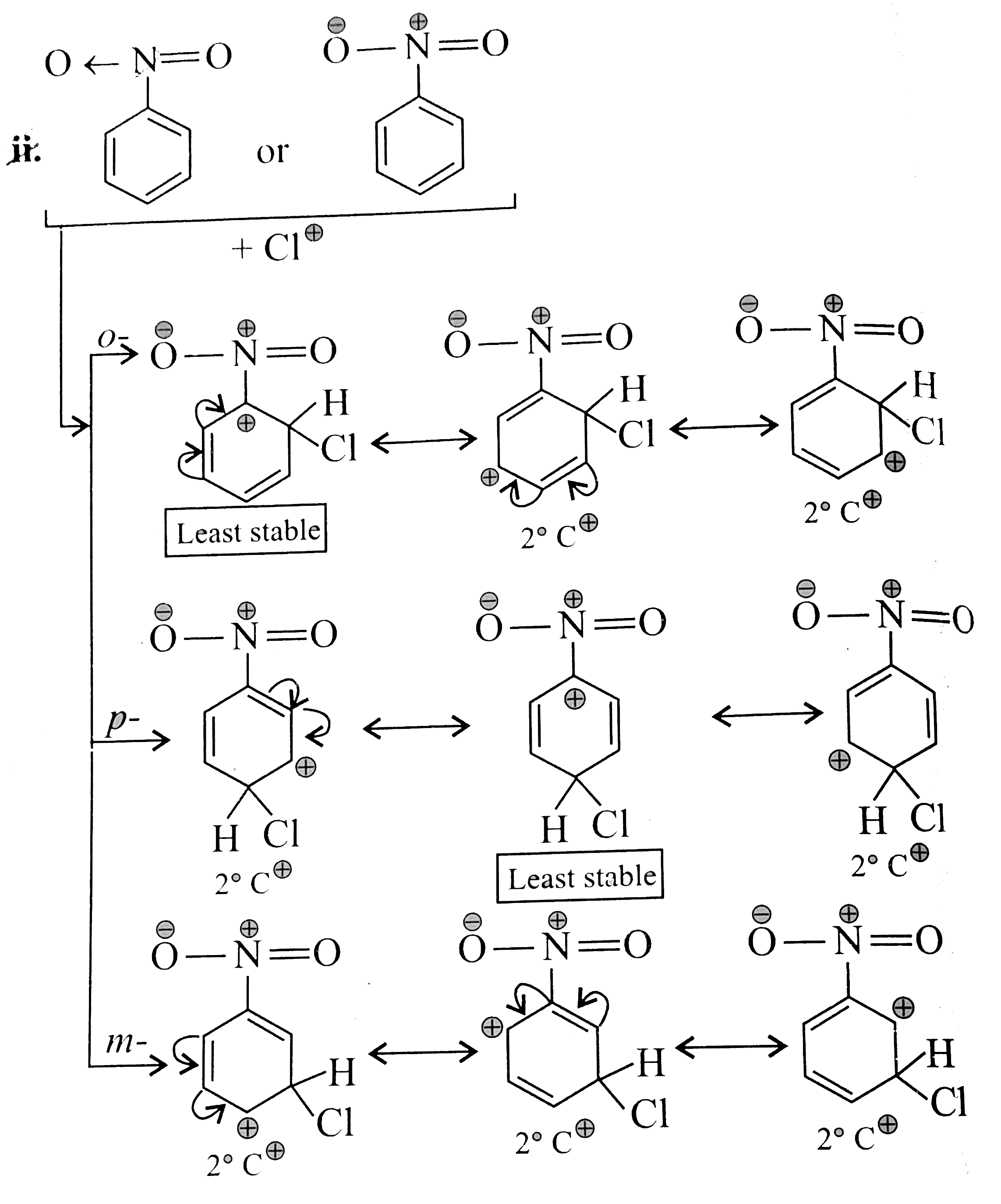 Write resonance-contributing structures for the intermedicate carbocation (arenonium ion) of (i) Phenol (ii) Nitrobenzene with electrophile CI^(o+) at the a. ortho-, b. para-, and c. meta-positions. |