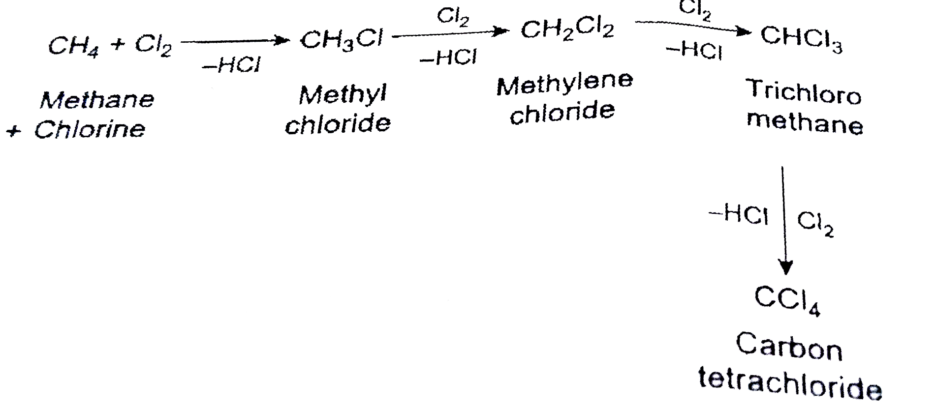 Answer» Solution :If LIMITED amount of methane is passed through the container 'A' methyl chloride is formed first .As the amount of methyl chlorideexceeds the CONCENTRATION of methnechlorine attacks on methly chloride rather than methane forming methylene chloride which in similar WAY gets chlorinated finally forming`"CC"l_4` The end product is a mixture f methane mthyl chloride methylene chalride ,trichloromehane and corbone TETRACHLORIDE. Insecond case if ecess of methane is passed ,only methyl chloride is formed . `underset("(excess)""" "Methyl chloride")(CH_4+Cl_2rarrHCl+CH_3Cl)` |