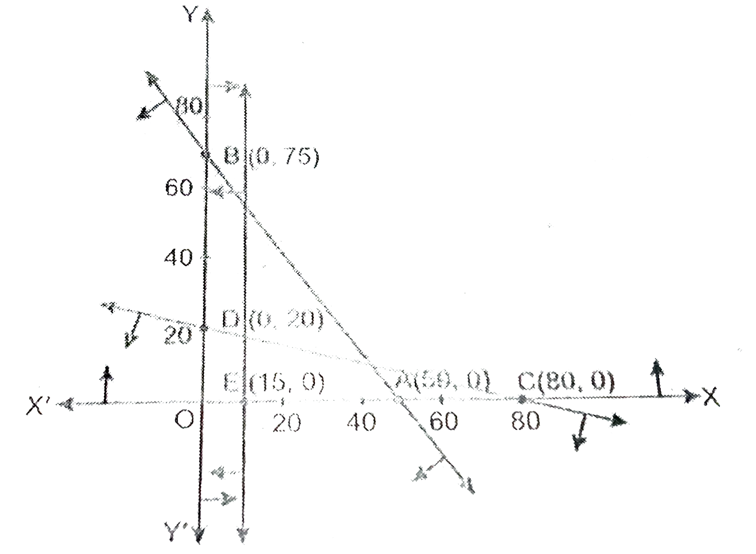 Answer» CORRESPONDING equation : ` 3x + 2y = 150 ` This LINE passes through the points A(50, 0)and B((0, 75). AB. At point (0, 0), from the inequation, `0le 150` (True) `:.` The solution of this inequation is that region of XY- plane in which (0, 0) lies. This line passes thrugh the point C(80, 0) and D(0, 20). Join CD. At point (0, 0), from the inequation, `0 le 10(True)` `:.` The solution of this inequation is that region of XY-plane divided by line CD in which (0, 0) lies. The solution of ` x ge 0, y ge 0 is in first quadrant. The solution of x`ge` 15 is x = 15 and its left SIDE ![]() `:.` The common solution of given inequations is shown by the shaded region. |