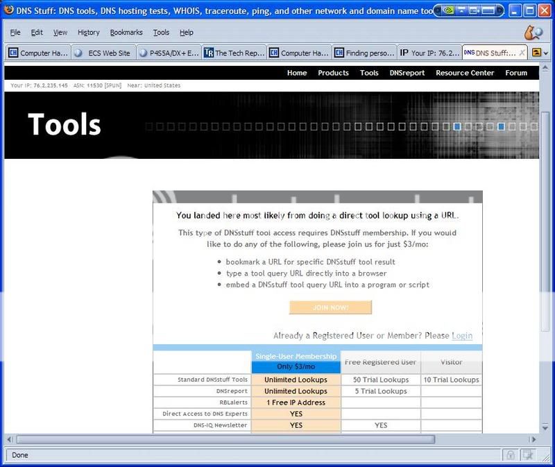 Answer» Hey there everyone, Then go hereI see that you must either join a fee-based service for $3/mo. or you can register at no cost and get a limited number of lookups.Quote from: WillyW on August 18, 2007, 01:03:17 PM This site can be fun to play with:It got my location wrong Quote from: soybean on August 18, 2007, 01:24:49 PM I see that you must either join a fee-based service for $3/mo. or you can register at no cost and get a limited number of lookups.You don't have to sign up to do a few lookups.Usually, about the best you can get from an IP is your ISP's address. A search for my IP will almost always bring up Reston, Virginia. I don't live near Virginia, nor have I ever even been there. The closest the admin here has been able to get to tracing me is MOUNTAIN View, which is still a few hours away from where I actually live.Quote from: Carbon Dudeoxide on August 18, 2007, 09:24:49 PM Quote from: WillyW on August 18, 2007, 01:03:17 PMThis site can be fun to play with:It got my location wrong It not only got my location wrong, it failed to identify my browser, OS, and referer.I never knew i was in Kansas... Quote from: 2k_dummy on August 19, 2007, 10:45:09 AM ... it failed to identify my browser, OS, and referer. Interesting. Any ideas as to why? Quote from: patio on August 19, 2007, 10:49:16 AM I never knew i was in Kansas... Quote from: Deerpark on August 19, 2007, 03:20:22 AM Quote from: soybean on August 18, 2007, 01:24:49 PMHmmm, on my Win XP Pro SP2 comp using Firefox, I get this when I enter my IP address in the IP Information box and click on Lookup. I can't go beyond that screen unless I click on Join Now or Login, which I can't do because I have not registered.I see that you must either join a fee-based service for $3/mo. or you can register at no cost and get a limited number of lookups.You don't have to sign up to do a few lookups. But, on ANOTHER computer (notebook w/Vista and using IE7), I could get lookups, just as you said. |