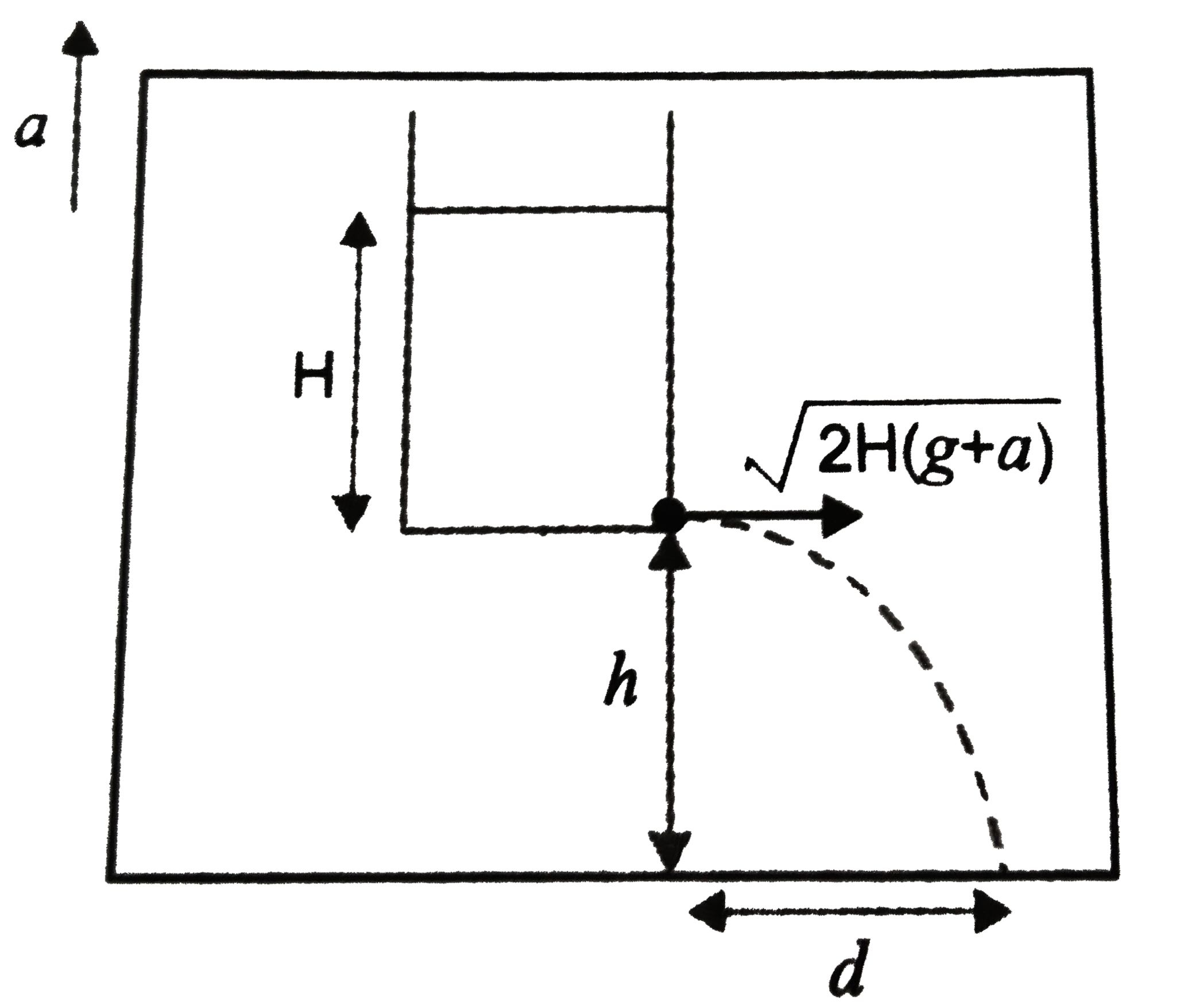 Answer» ` P-2, Q-3 , R-2 S-4` Refer to Fig. 2 (CF) . 58`. Wvlocity of effux, ` v-x = sqrt(2 (g+a) H)` time taken by water in reaching the floor, ` t= sqrt ( 2 h)/( (g+a))` :. Horizontal range, ltbRgt ` d= v_x t= sqrt (2 (g +a) H) XX sqrt (2 h)/(g+a) = 2 sqrt (H//h)` . , If lift is acceleration vetically downwards, with accleration `a` then horizontal range, ` d= sqrt(2 (g-a)H) xx sqrt (2 h)/(g-a) = 2 sqrt Hh` When lift is moving vertically up with constant speed then ` d= sqrt (2 gH) xx sqrt (2h)/g` = 2 sqrt H h` when lift is falling FREELY, then the warter jar is in weightlessness state. Hence, no water leaks out of jet.theus, option (c) is TRUE. |